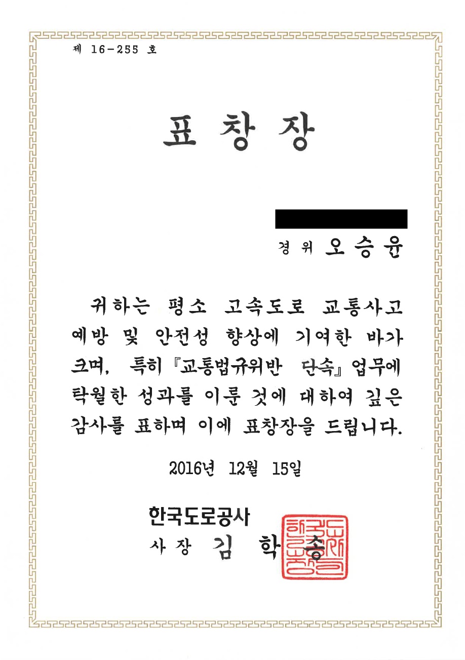 · 한국도로공사사장 표창장 (교통안전과, 2016)