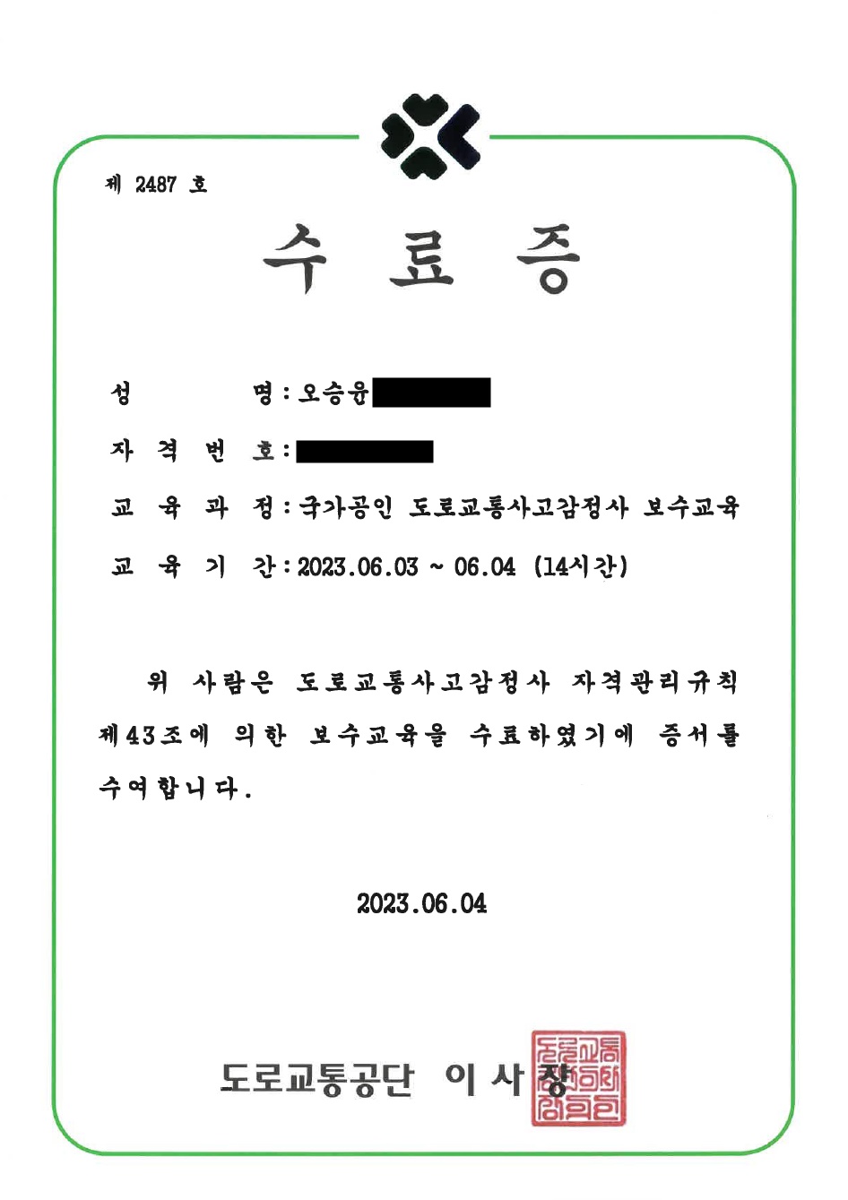 · 수료증 (국가공인 도로교통사고감정사 보수교육, 2023)