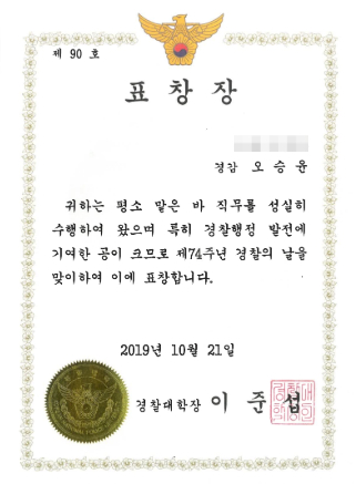 · 경찰대학장 표창 (행정발전, 2019)
