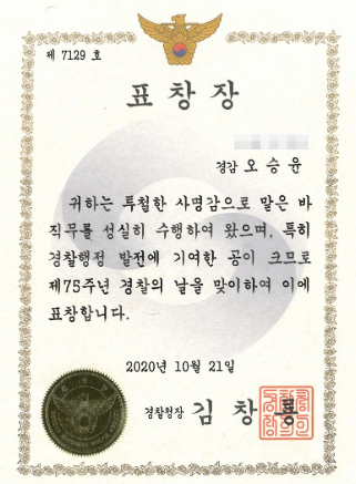 · 경찰청장 표창 (행정발전, 2020)