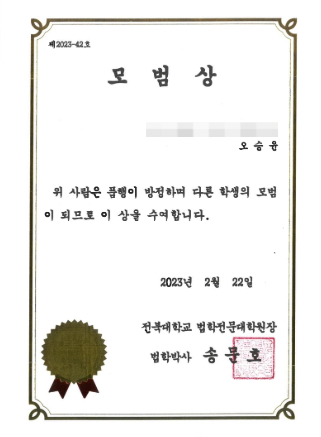 · 전북대학교 법학전문대학원장상 (모범상, 2023)