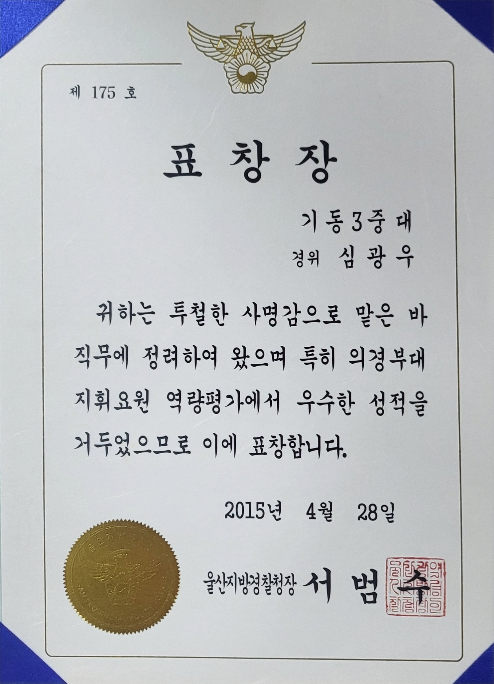 · 울산경찰청장 표창 (의경관리 우수, 2015)