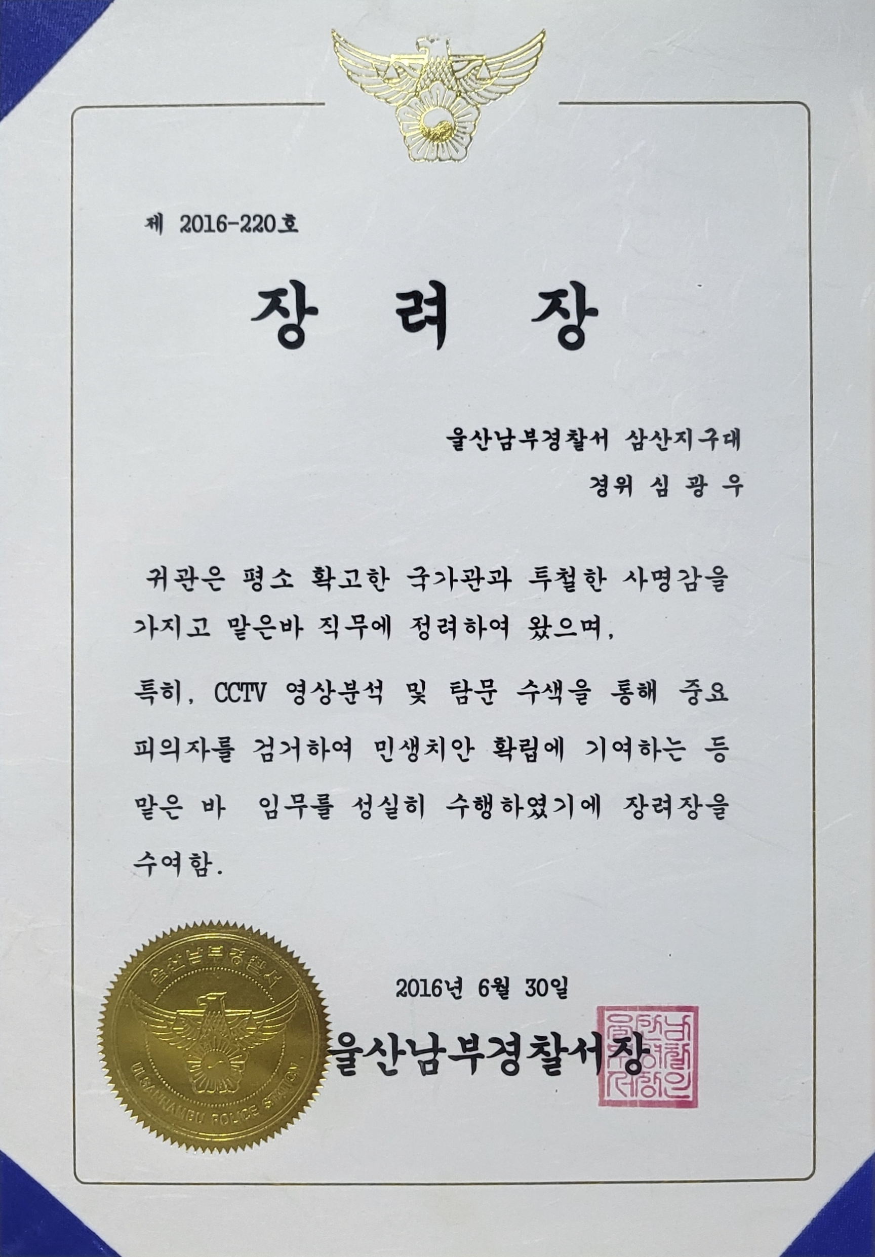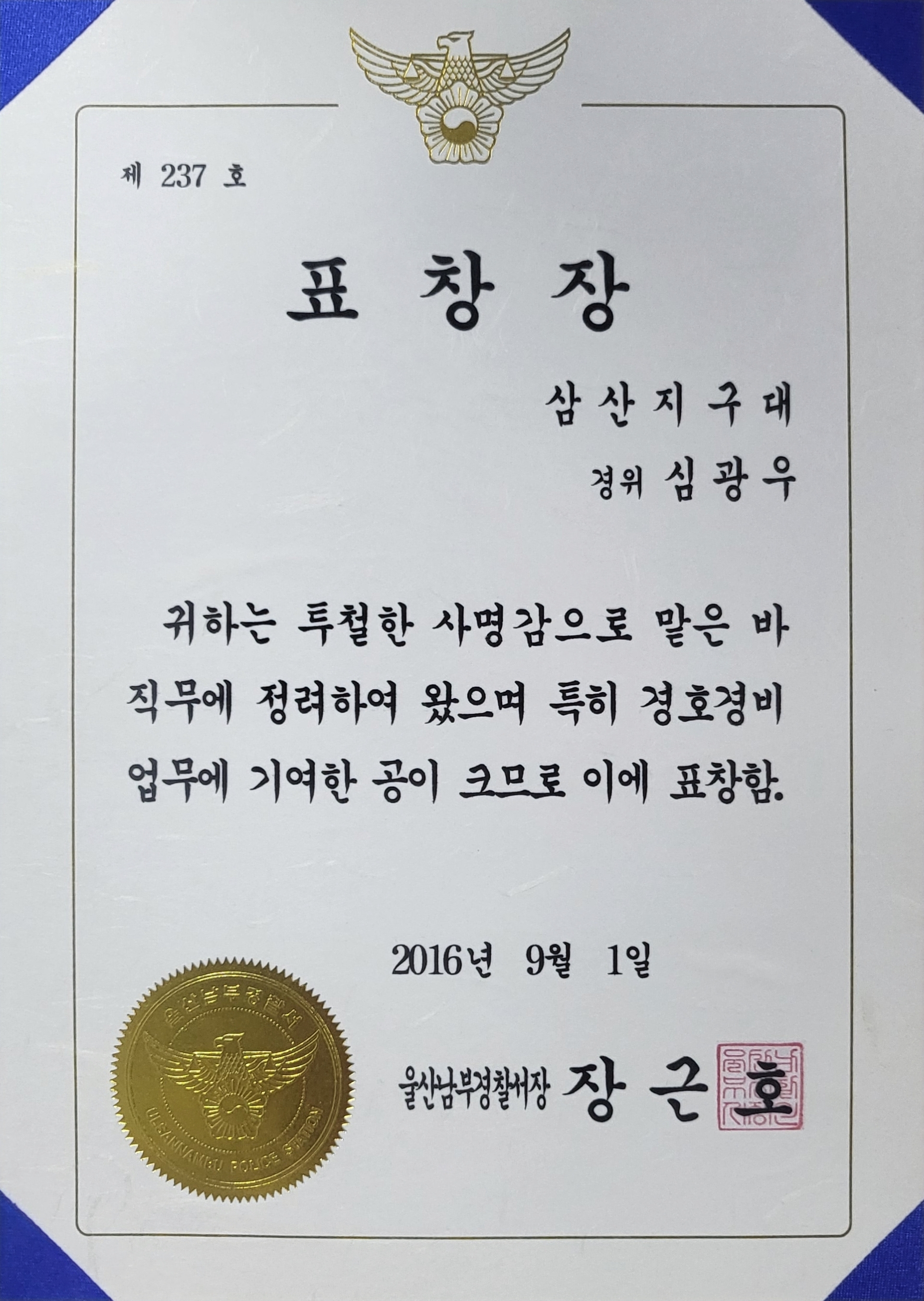 · 울산남부경찰서장 표창 (경호경비업무, 2016)