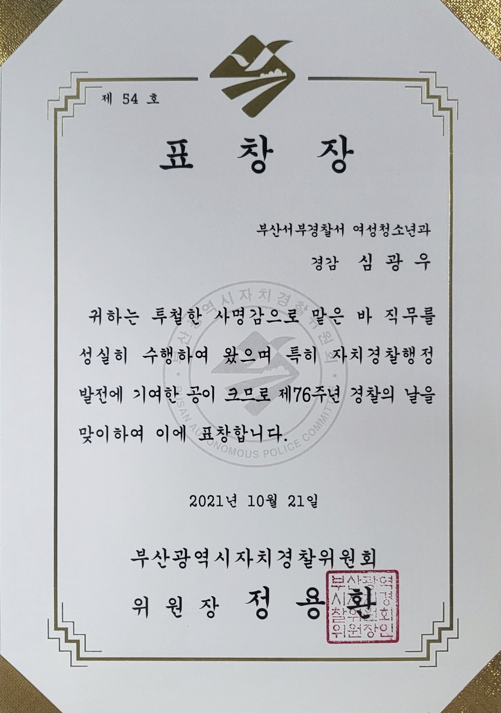 · 부산자치경찰위원장 표창 (자치경찰행정발전, 2021)