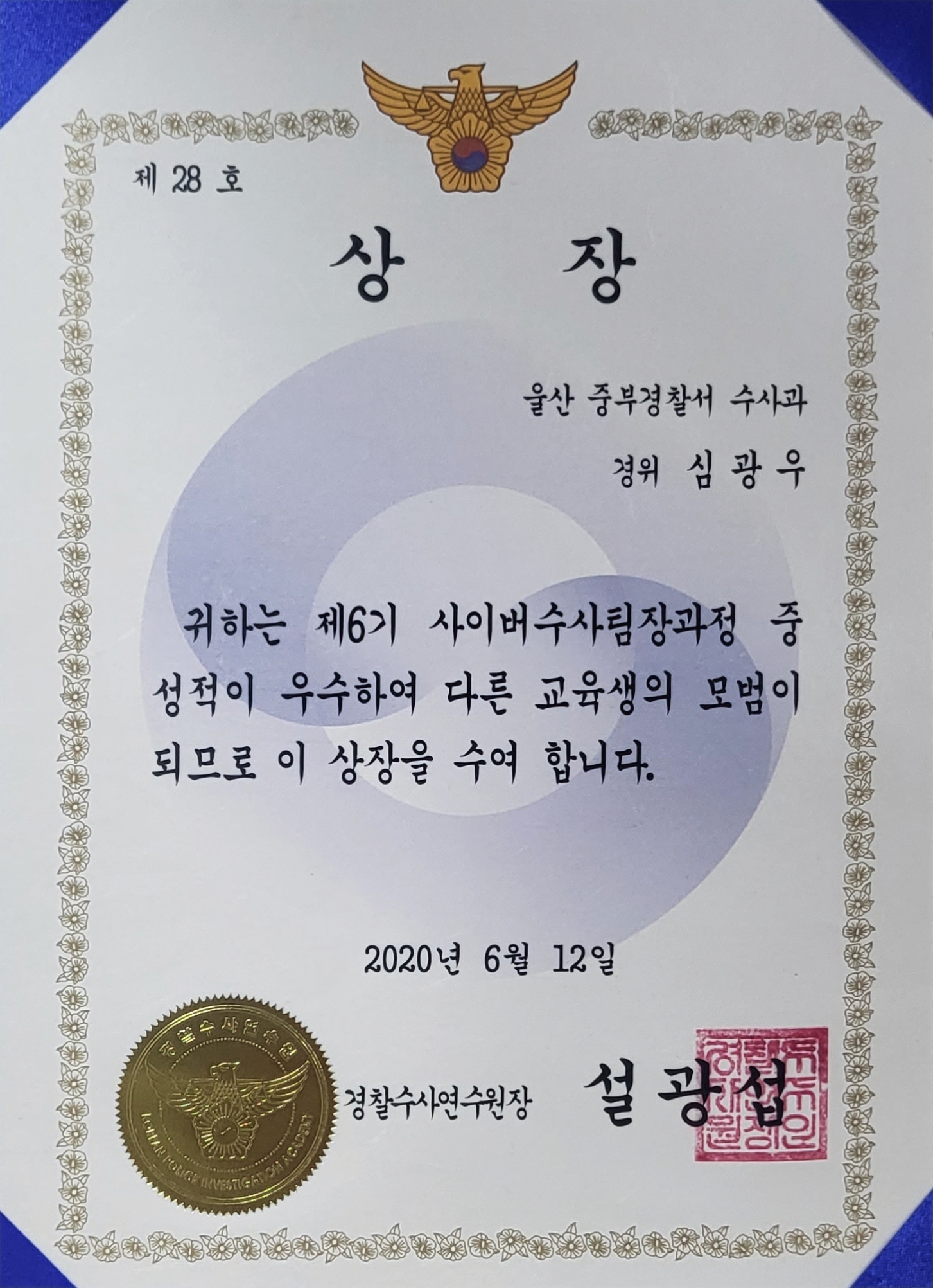 · 경찰수사연수원장 상장 (사이버수사팀장과정 성적우수, 2020)