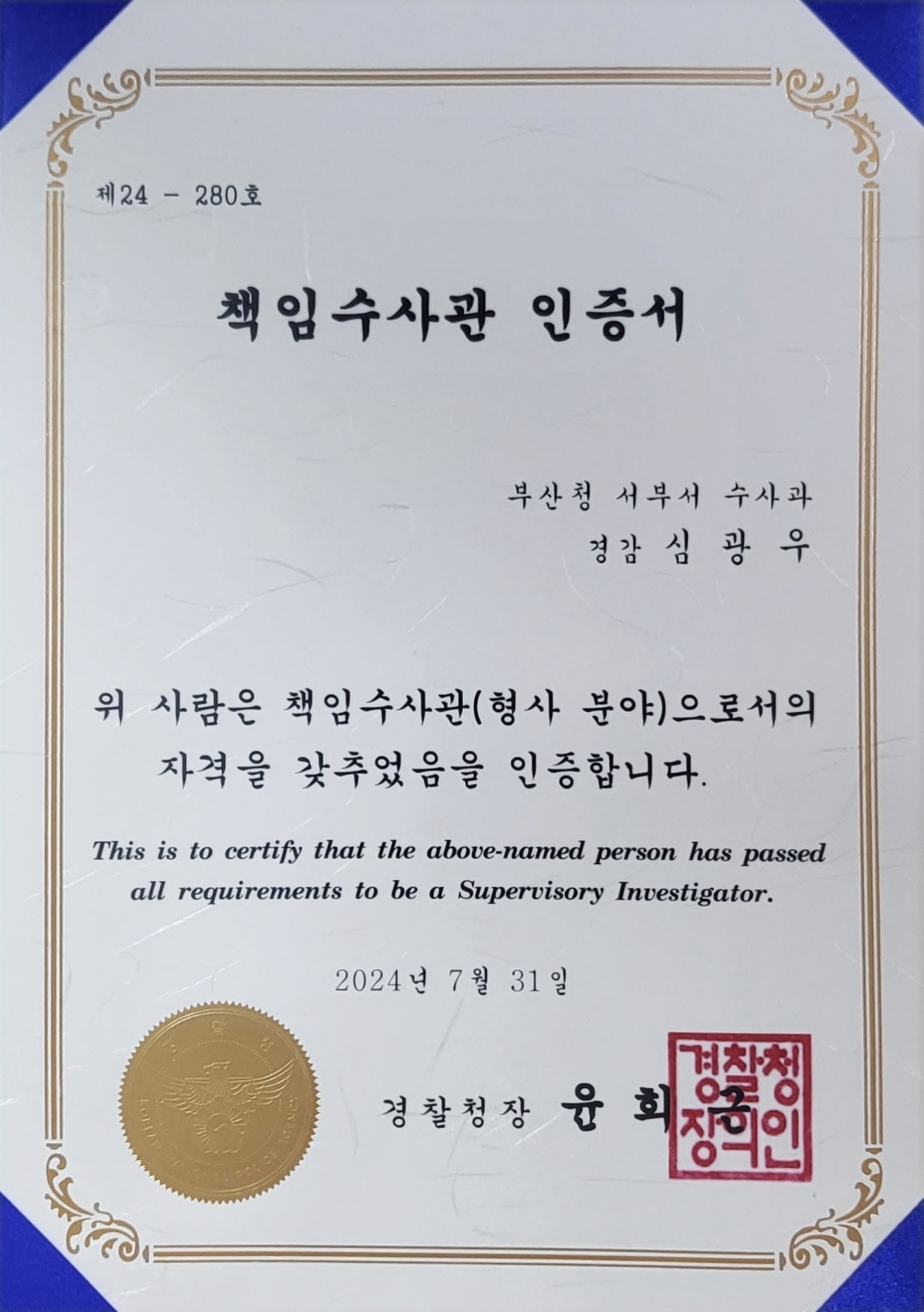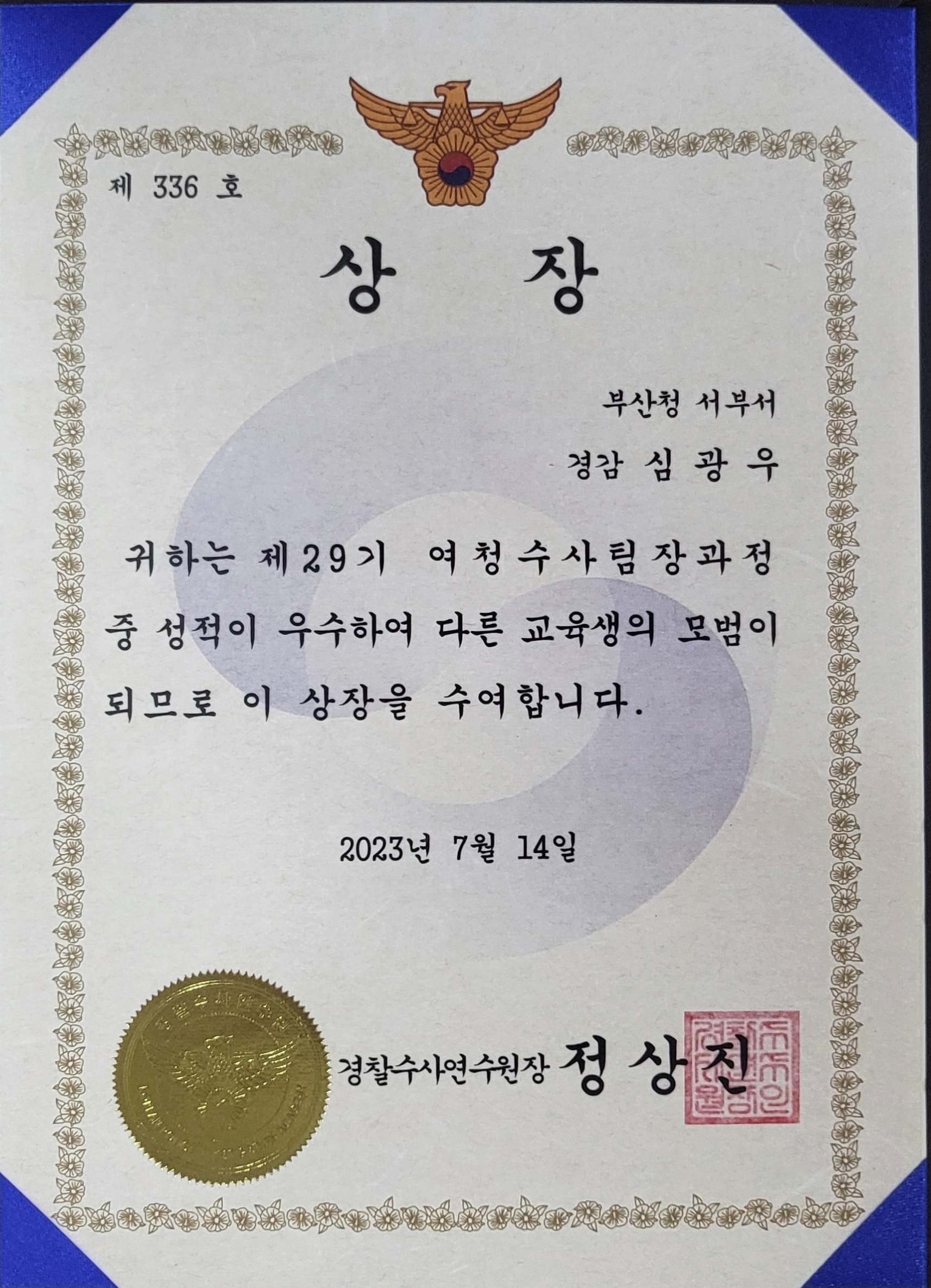 · 경찰수사연수원장상 (여청수사팀장과정 성적우수, 2023)