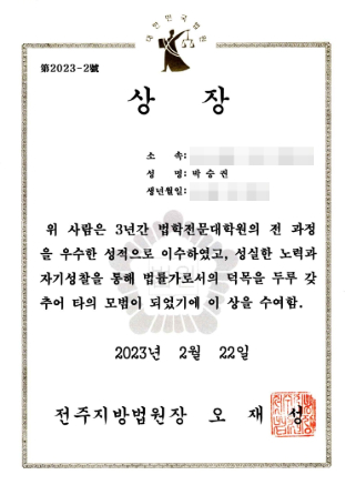 · 전주지방법원장상 (성적우수, 2023)