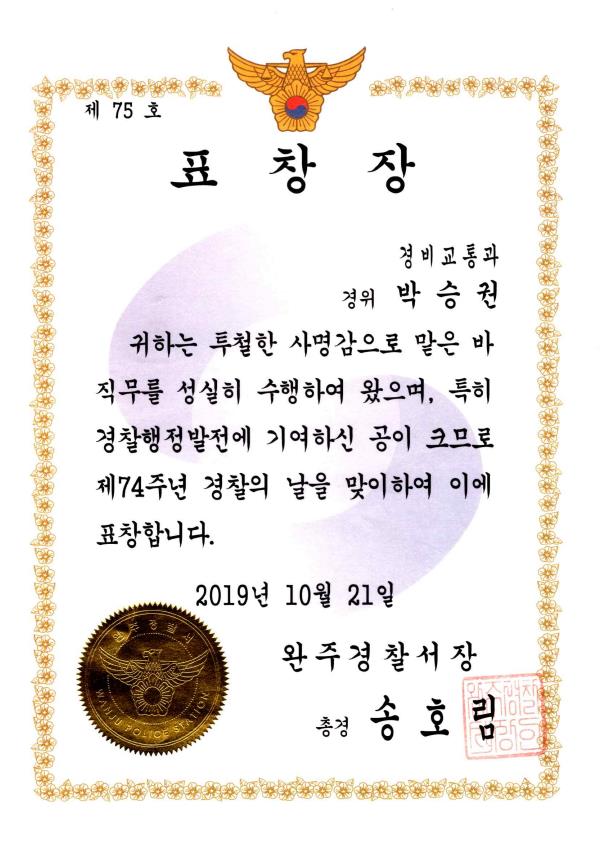 · 전주완주경찰서장 표창 (행정발전, 2019)