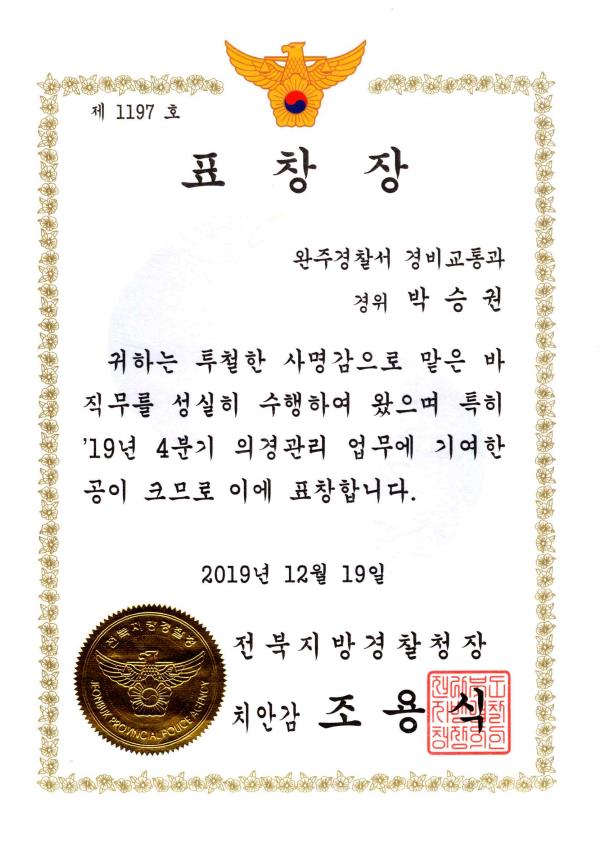· 전북경찰청장 표창 (의경관리 우수, 2019)