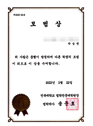· 전북대학교 법학전문대학원장상 (모범상, 2023)
