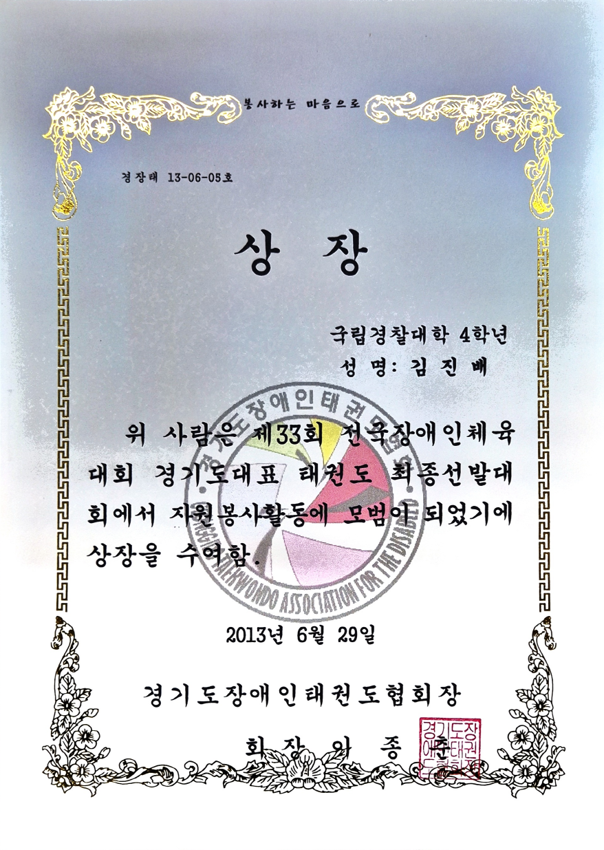 · 경기도장애인태권도협회장상 (모범활동, 2013)