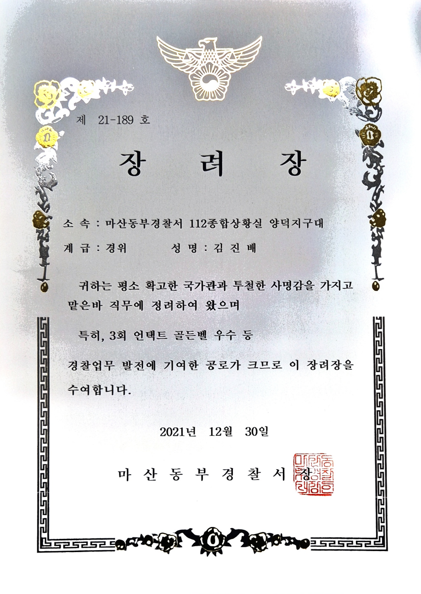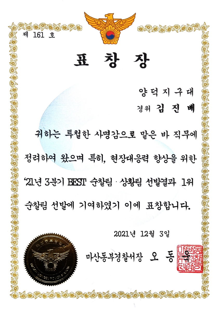 · 마산동부경찰서장 표창장 (우수 순찰팀, 2021)