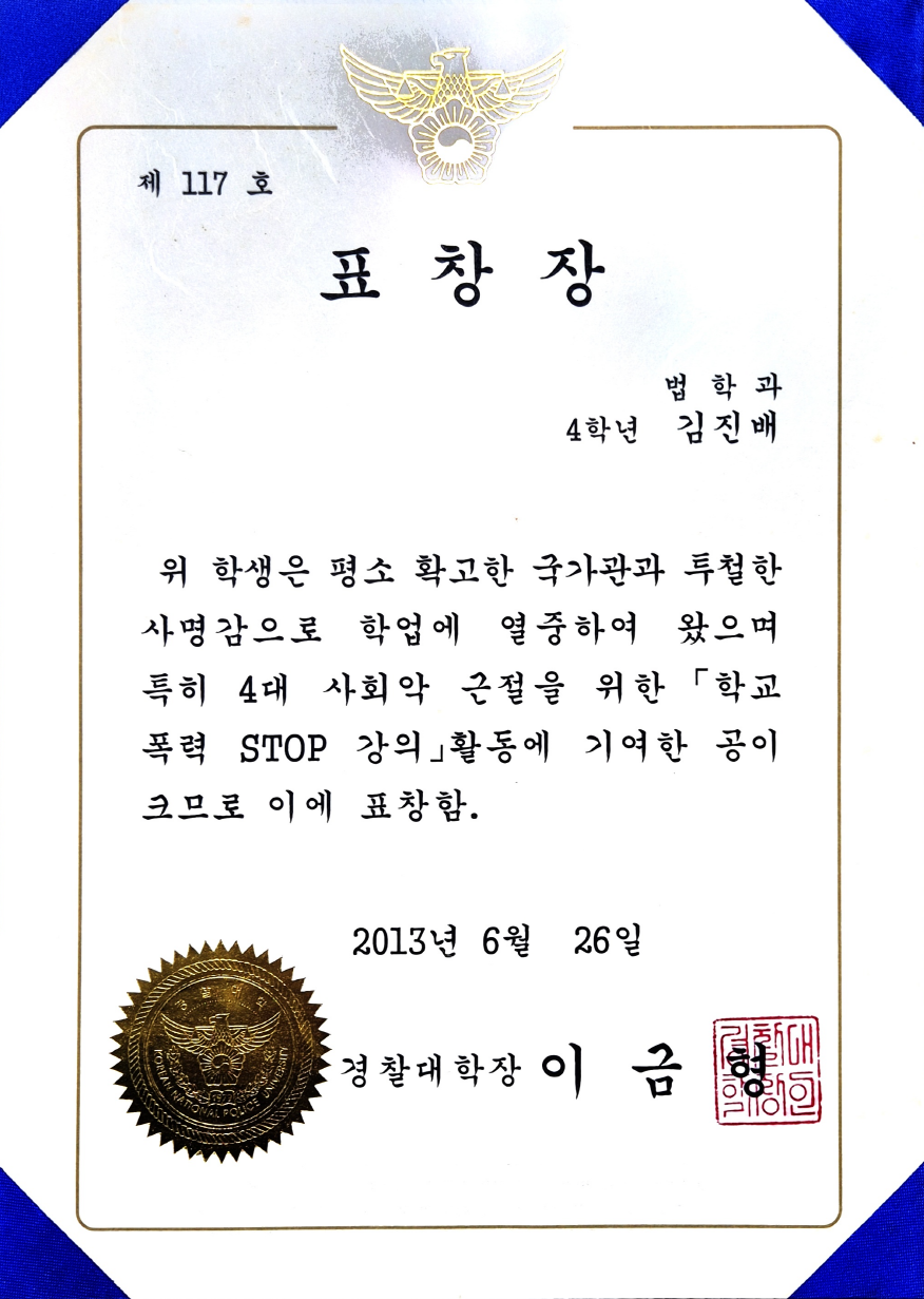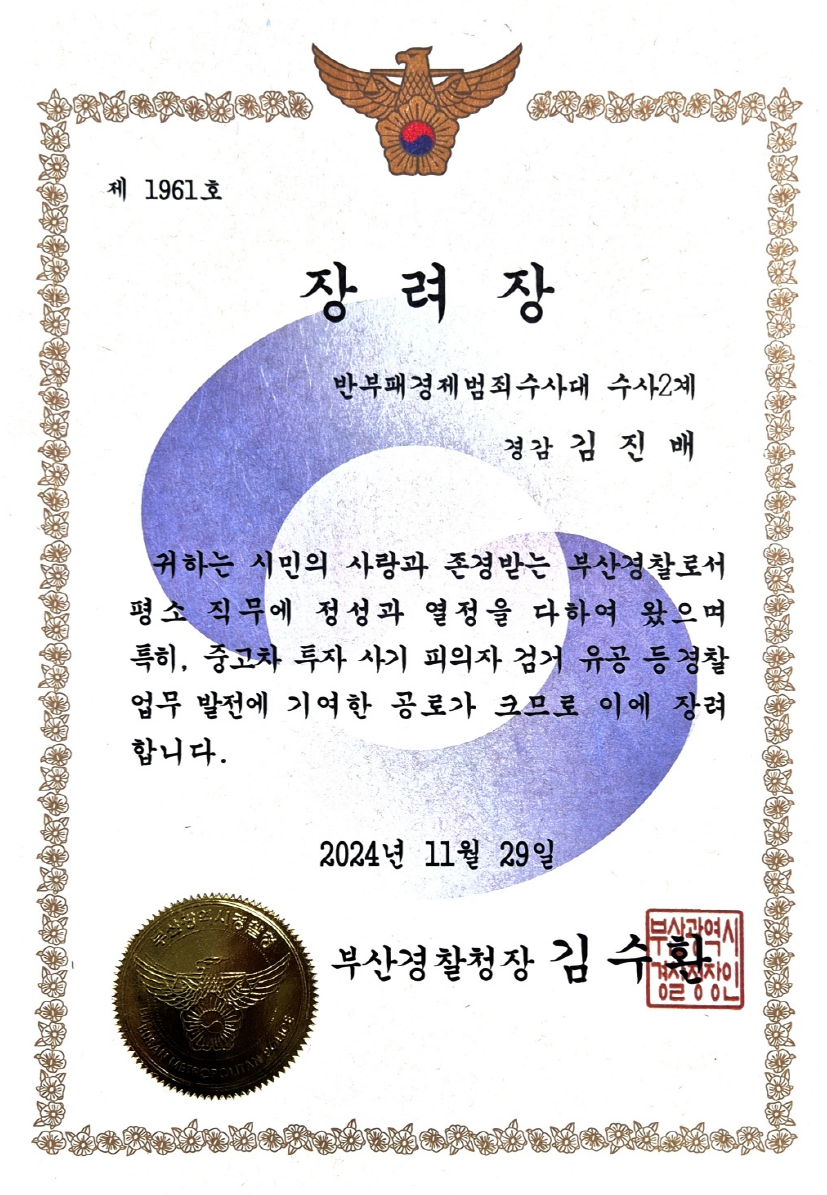 · 부산경찰청장 표창 (중고차투자사기 피의자 검거, 2024)