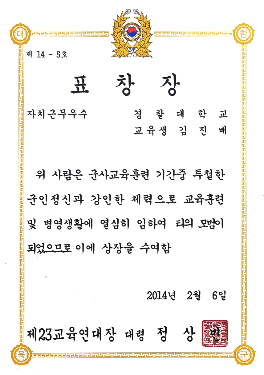 · 제23교육연대장 표창 (자치근무우수, 2014)
