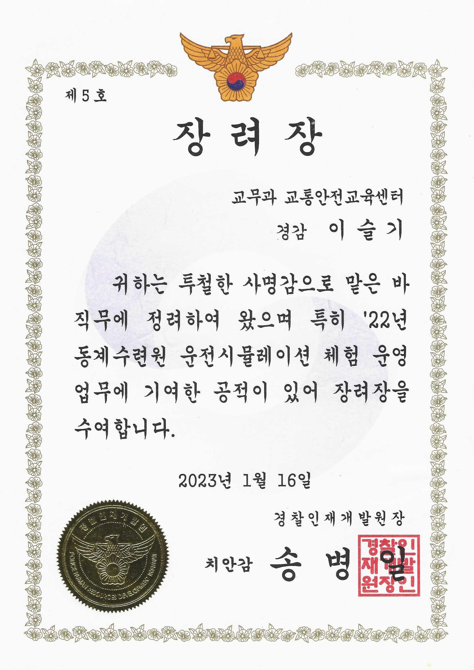 · 경찰인재개발원장 장려장 (운전시뮬레이션 운영, 2023)