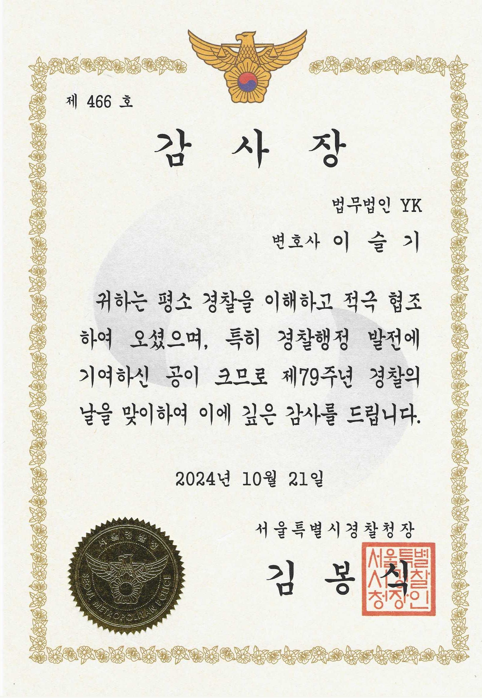 · 서울경찰청장 감사장 (행정발전, 2024)