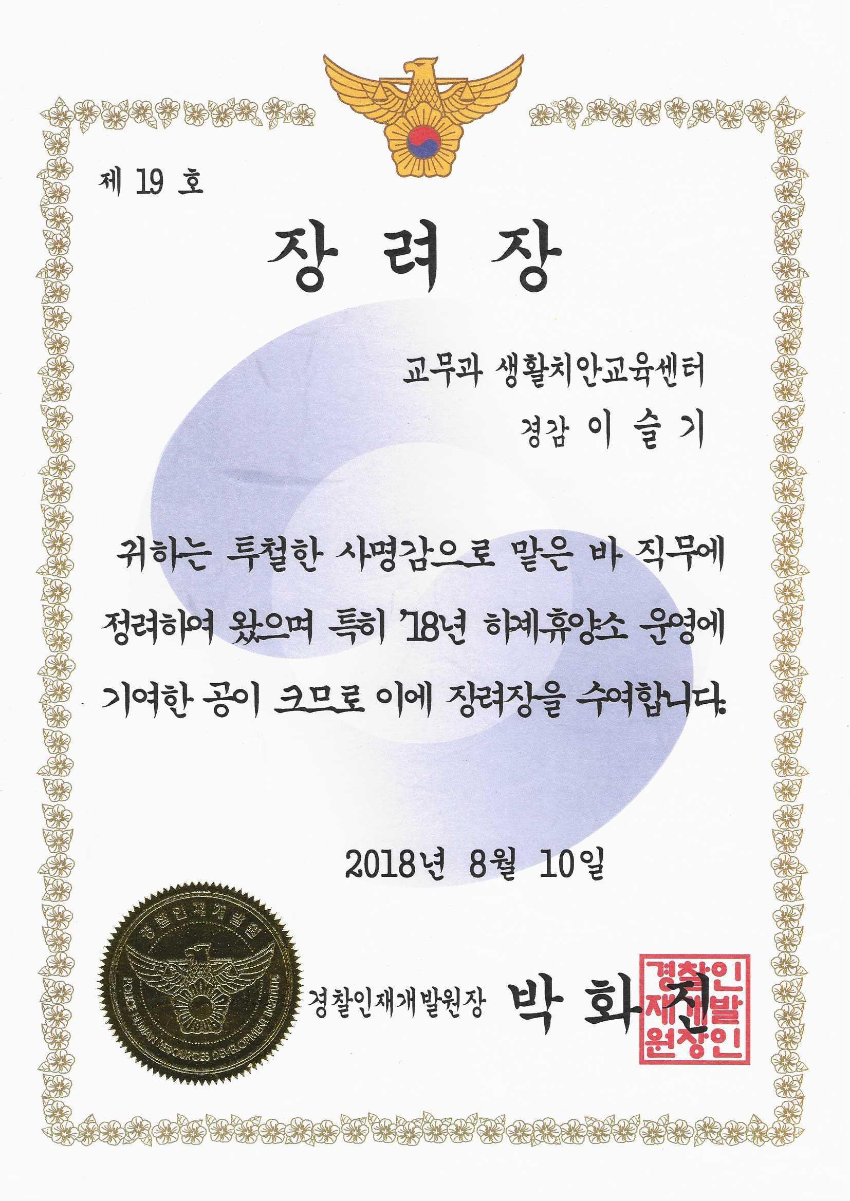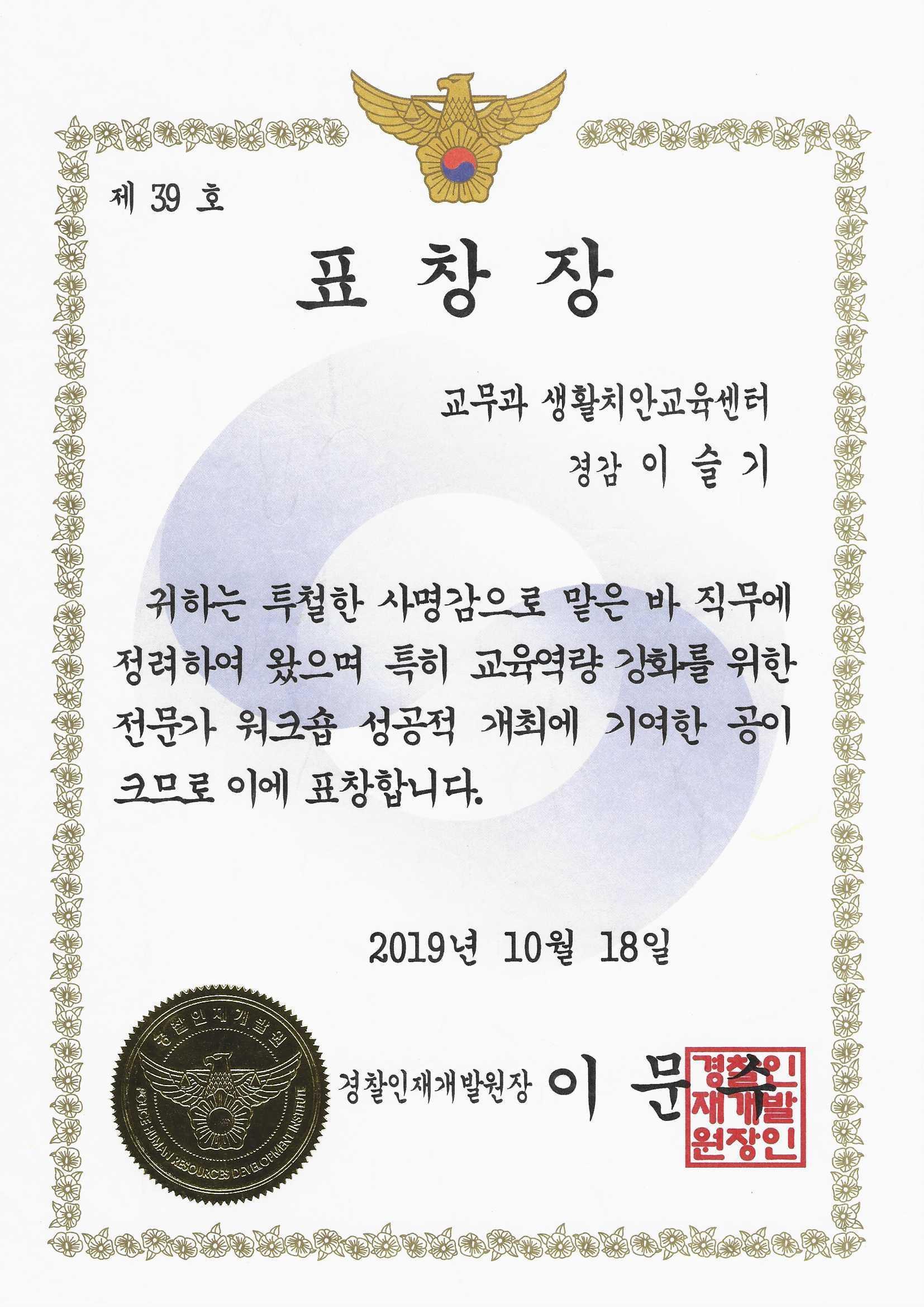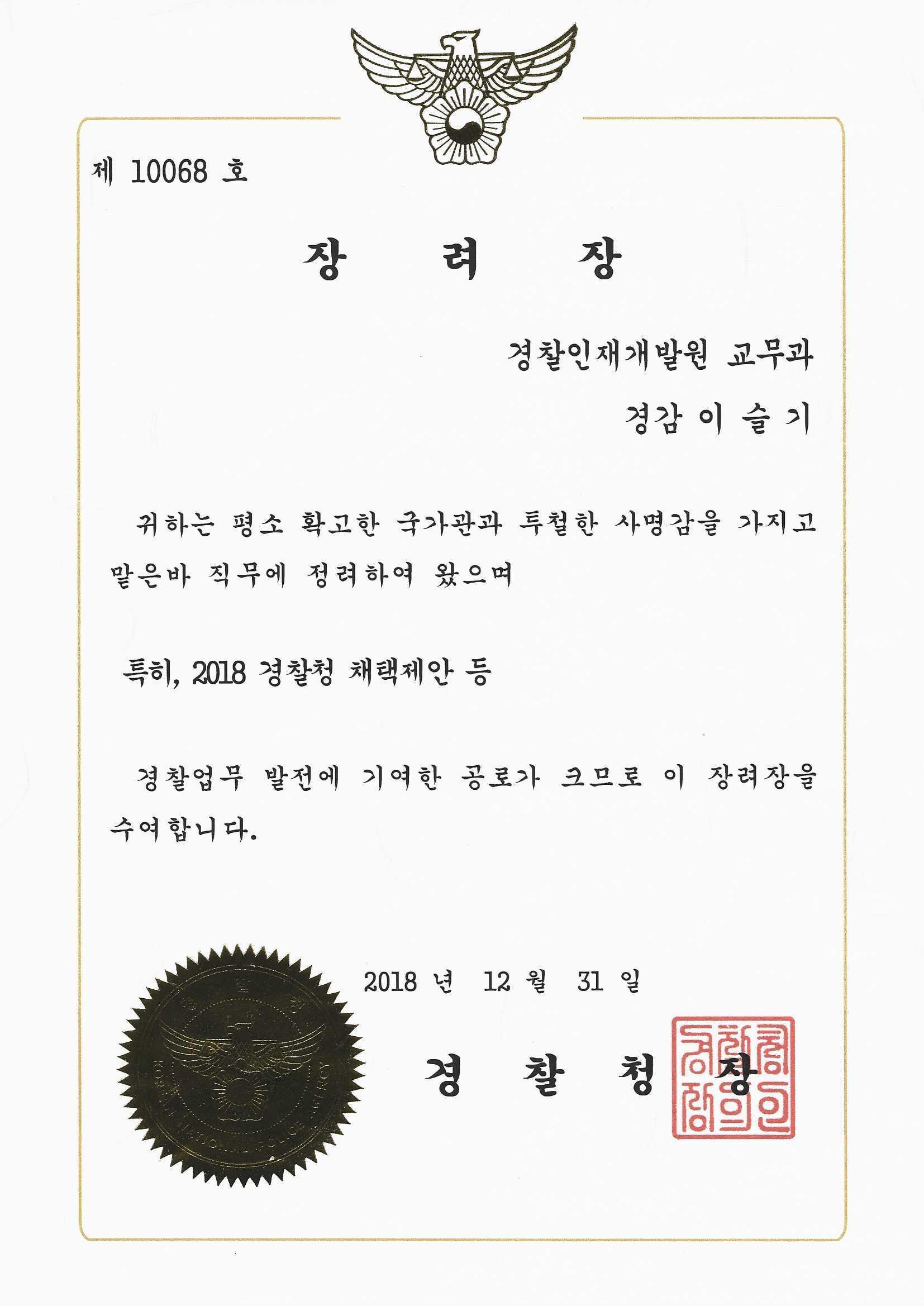· 경찰인재개발원장 표창 (행정발전, 2019)