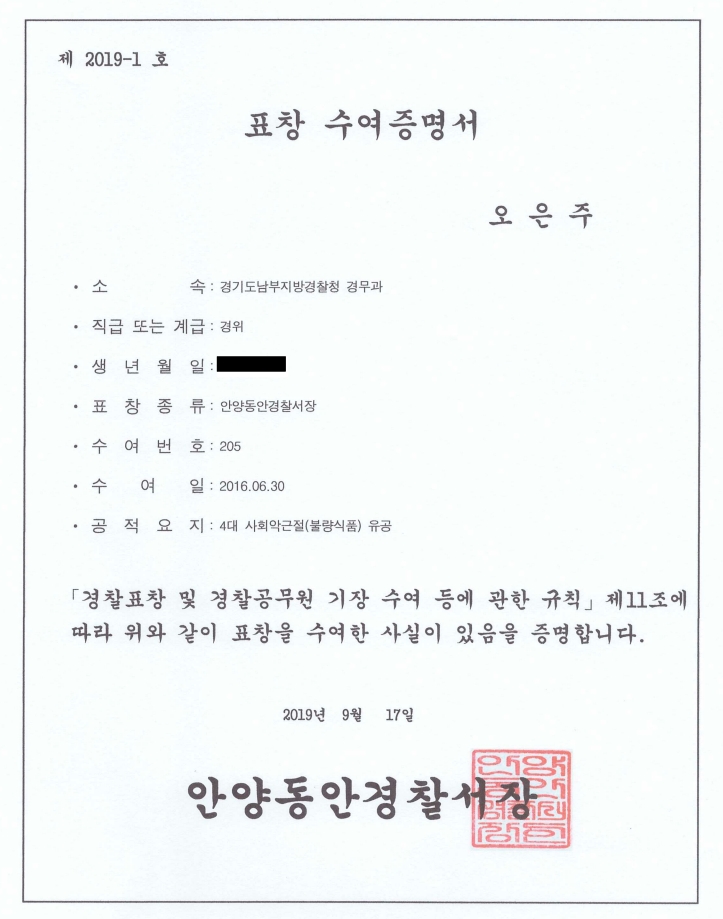 · 안양동안경찰서장 (4대 사회악근절(불량식품) 유공, 2019)