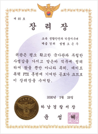 · 하남경찰서장 장려장(데이트폭력 FTX 훈련 기여, 2020)