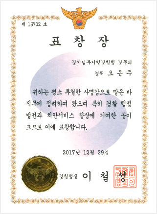 · 경기남부경찰청장 표창 (행정발전, 2017)