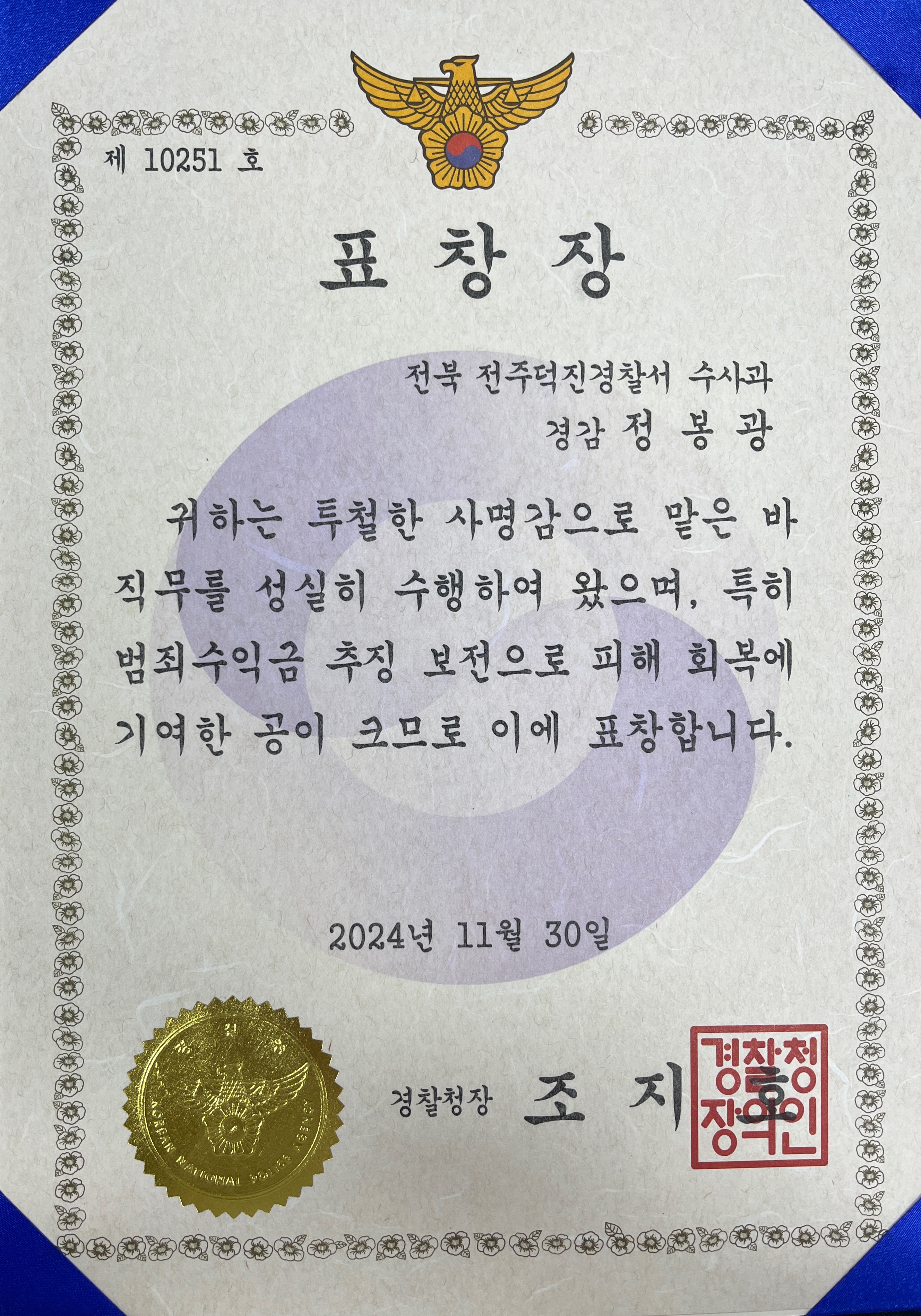 · 경찰청장 표창 (범죄수익금 추징 보전, 2024)
