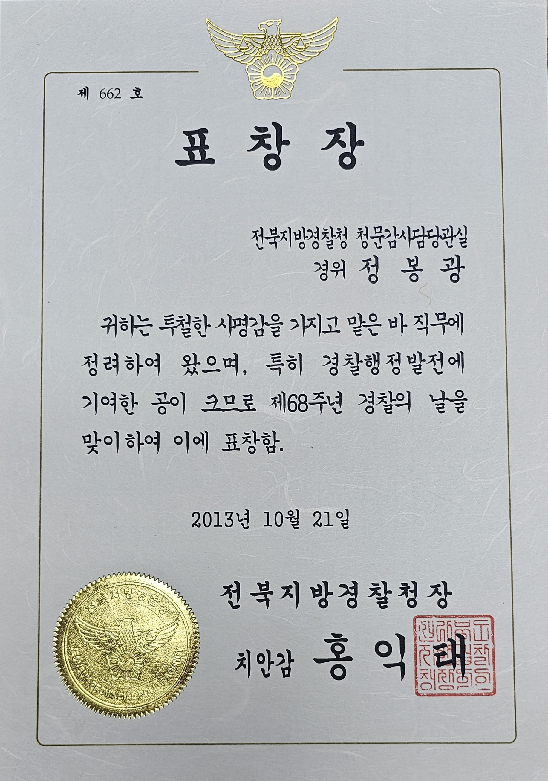 · 전북경찰청장 표창 (행정발전, 2013)