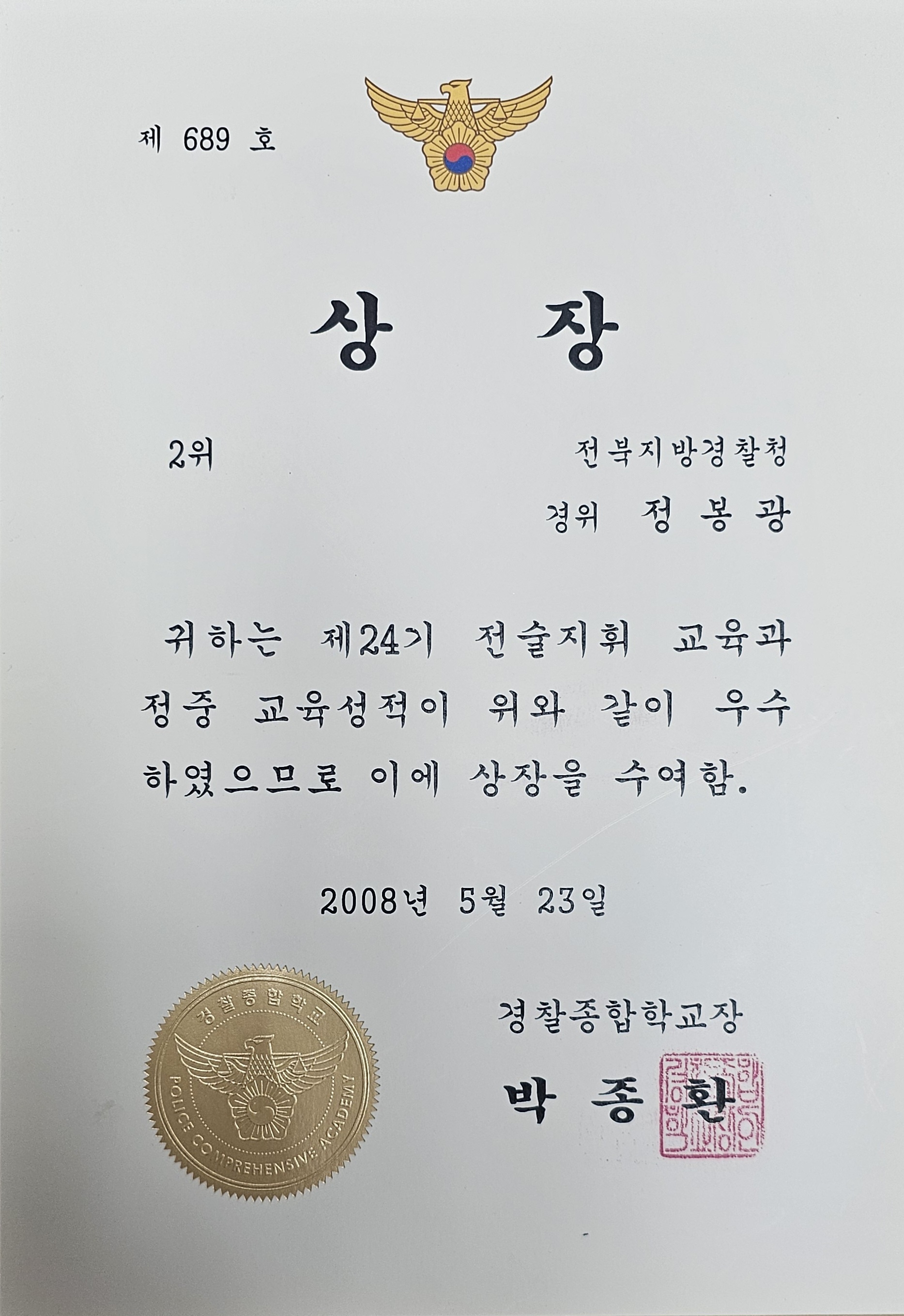· 경찰종합학교장상 (전술지휘교육 성적우수, 2008)