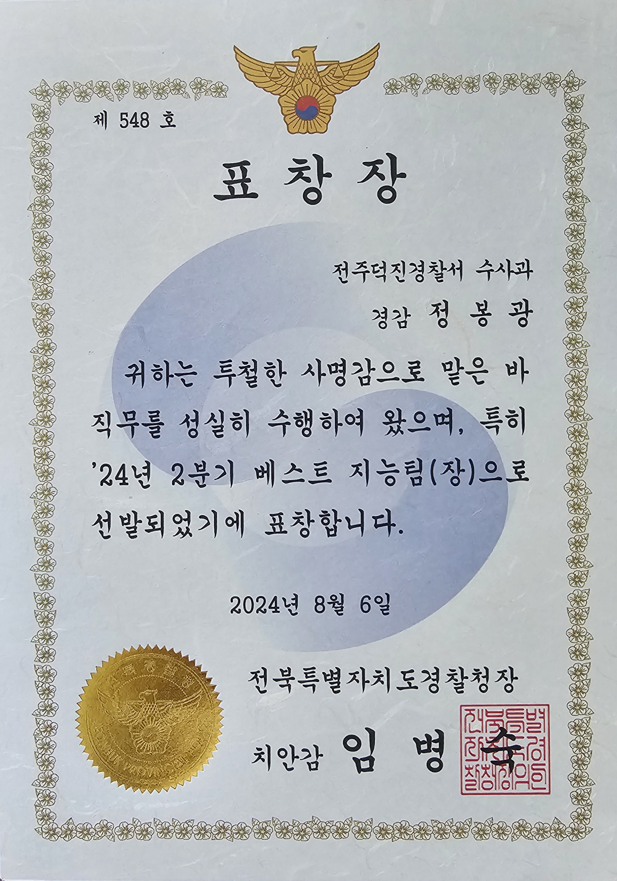 · 전북경찰청장 표창 (우수 지능팀장, 2024)
